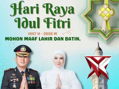 Selamat Hari Raya Idul Fitri 1447 HMar 21, 2026 07:45 - Berita - 4 viewsKapolres Musi Banyuasin AKBP Ruri Prastowo dan Ketua Bhayangkari Cabang Muba Ny. Dian Ruri Prastowo Mengucapakan Selamat Hari Raya Idul Fitr Mohon Maaf Lahir dan Bhatini -