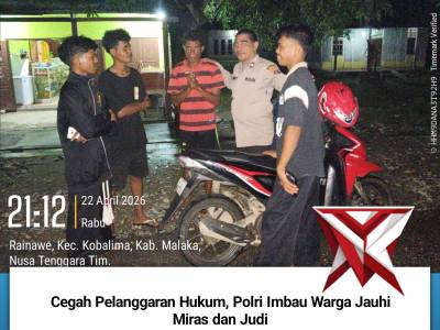 Cegah Pelanggaran Hukum, Polri Imbau Warga Jauhi Miras dan Judi - PoliceTubeApr 27, 2026 12:54 - Berita - 0 viewsCegah Pelanggaran Hukum, Polri Imbau Warga Jauhi Miras dan Judi Malaka – Upaya menjaga situasi keamanan dan ketertiban masyarakat (kamtibmas) terus dilakukan jajaran Polres Malaka melalui pendekatan humanis dan preventif. Salah satunya ditunjukkan oleh p... -