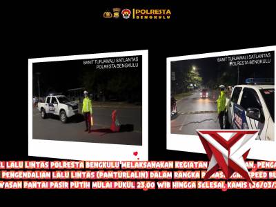 Personel Lantas dan Dishub Kota Bengkulu Pasang Speed Bump malam hari di Pantai Pasir Putih. - Polic...Apr 01, 2026 18:48 - Berita - 0 viewsPersonel lalu lintas dan Dishub Kota Bengkulu melaksanakan kegiatan pengamanan, pengaturan, dan pengendalian lalu lintas (Pamturlalin) dengan pemasangan speed bump di kawasan Pantai Pasir Putih mulai pukul 23.00 WIB hingga selesai, Kamis (26/3/2026). Keg... -