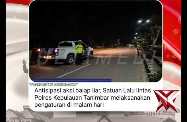 Antisipasi aksi balap liarDec 15, 2025 22:07 - Berita - 39 viewsCegah aksi balap liar satuan lalulintas polres Kepulauan Tanimbar lakukan pengaturan pada malam hari -