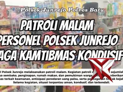 Patroli Malam Personel Polsek Junrejo Jaga Kamtibmas KondusifApr 17, 2026 07:30 - Berita - 6 viewsPersonel Polsek Junrejo melaksanakan patroli malam. Kegiatan patroli dilakukan di sejumlah lokasi seperti toko sembako, penginapan, rumah makan, dan pemukiman warga dengan memberikan imbauan kamtibmas terkait keamanan, antisipasi peredaran uang palsu, ser... -