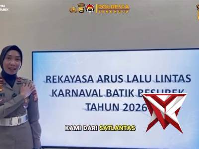 Rekayasan Lalu Lintas dalam rangka Karnaval kain Batik Besurek - PoliceTubeApr 17, 2026 15:37 - Berita - 8 viewsNah adik sanak.. iko himbauan langsung untuk area penutupan jalan kegiatan Karnaval Batik Besurek kelak.. cubo kito simak nenian ?? Pemerintah Kota Bengkulu melalui Dinas Pariwisata mempersiapkan Karnaval Batik Internasional 2026 bertema ”Gemerlap Besurek... -