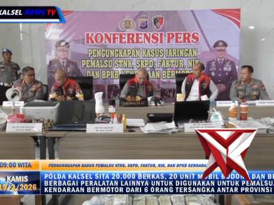 Polda Kalsel Sita 20.000 Berkas dan 20 Mobil Bodong dari Sindikat Pemalsu Dokumen Kendaraan - Police...Feb 21, 2026 03:01 - Berita - 12 viewsPolda Kalsel Sita 20.000 Berkas dan 20 Mobil Bodong dari Sindikat Pemalsu Dokumen Kendaraan Lintas Provinsi Sebanyak 20 unit mobil, dan hampir 20.000 lembar dokumen palsu bersama enam tersangka berhasil diamankan jajaran Direktorat Reserse Kriminal Umum... -