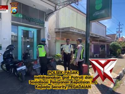 Anggota Polsek Pagak laksanakan giat patroli dan sosialisasi pelayanan Kepolisian 110 di pegadaianFeb 28, 2026 15:35 - Berita - 7 viewsAnggota Polsek Pagak laksanakan giat patroli dan sosialisasi pelayanan Kepolisian 110 di pegadaian -