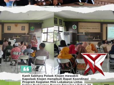 Kanit Sabhara Polsek Klojen mewakili Kapolsek Klojen mengikuti Rapat Koordinasi Program Kegiatan - P...Feb 24, 2026 04:58 - Berita - 8 viewsKanit Sabhara Polsek Klojen mewakili Kapolsek Klojen mengikuti Rapat Koordinasi Program Kegiatan Mini Lokakarya Lintas Sektor Puskesmas Bareng Triwulan I Tahun 2026, di Ruang Pertemuan Puskesmas Bareng Jl. Bareng Tenes IV A No. 639 Kel. Bareng, Kec. Kloje... -