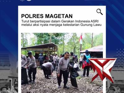 Polres Magetan Dukung Gerakan Indonesia ASRI di Gunung Lawu - PoliceTubeFeb 18, 2026 21:06 - Berita - 17 viewsPolres Magetan turut berpartisipasi dalam Gerakan Indonesia ASRI (Aman, Sehat, Resik, Indah) melalui aksi nyata menjaga kelestarian Gunung Lawu pada Selasa, 17 Februari 2026. Kegiatan ini merupakan wujud kepedulian bersama dalam menjaga lingkungan hidup,...