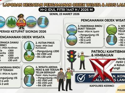 "H+2 Lebaran, Polres Kerinci Pastikan Objek Wisata Aman dan Arus Lalu Lintas LancarMar 24, 2026 03:46 - Berita - 4 views"H+2 Lebaran, Polres Kerinci Pastikan Objek Wisata Aman dan Arus Lalu Lintas Lancar dalam Operasi Ketupat Siginjai 2026" ? ?Memasuki H+2 Hari Raya Idul Fitri 1447 H, jajaran Polres Kerinci memperketat pengamanan di sejumlah objek wisata populer di wilayah... -