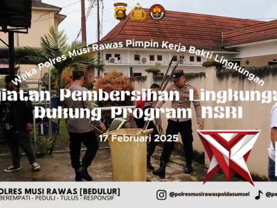 Waka Polres Musi Rawas Pimpin Kegiatan Pembersihan Lingkungan, Wujud Nyata Dukungan Program ASRI ? -...Feb 22, 2026 16:12 - Berita - 5 viewsWakil Kepala Kepolisian Resor Musi Rawas, Kompol Hendri, S.H., memimpin langsung kegiatan pembersihan lingkungan di area Kantor Polres Musi Rawas sebagai bentuk dukungan terhadap Program ASRI (Aman, Sehat, Rapi, dan Indah). Kegiatan ini dilaksanakan bersa... -