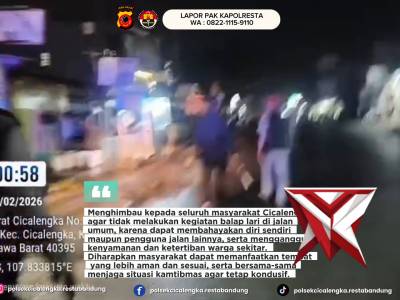 Polsek Cicalengka Menghimbau agar tidak melakukan kegiatan balap lari dijalan Umum.Feb 22, 2026 23:31 - Berita - 8 viewsPolsek Cicalengka menghimbau kepada seluruh masyarakat Cicalengka agar tidak melakukan kegiatan balap lari di jalan umum, karena dapat membahayakan diri sendiri maupun pengguna jalan lainnya, serta mengganggu kenyamanan dan ketertiban warga sekitar. Dihar... -