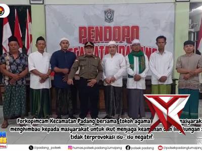 Forkopimcam Kecamatan Padang bersama tokoh agama dan tokoh masyarakat menghimbau kepada masyarakatFeb 21, 2026 16:54 - Berita - 12 viewsForkopimcam Kecamatan Padang bersama tokoh agama dan tokoh masyarakat menghimbau kepada masyarakat untuk ikut menjaga keamanan dan lingkungan serta tidak terprovokasi isu- isu negatif. -