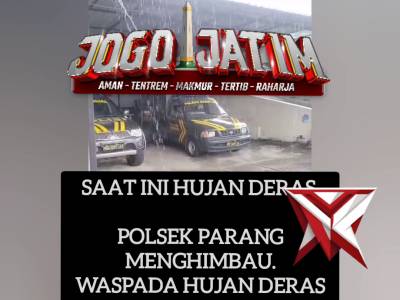 Saat Ini Hujan Deras. Polsek Parang Menghimbau. Waspada Hujan Deras Intensitas tinggi - PoliceTubeMar 02, 2026 14:08 - Berita - 4 viewsSaat Ini Hujan Deras. Polsek Parang Menghimbau. Waspada Hujan Deras Intensitas tinggi -
