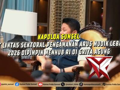 KAPOLDA SUMSEL RAPAT LINTAS SEKTORAL PENGAMANAN ARUS MUDIK LEBARAN 2026 DIPIMPIN MENHUB RI - PoliceT...Feb 25, 2026 20:40 - Berita - 8 viewsKapolda Sumsel Tegaskan Kesiapan Pengamanan Arus Mudik Lebaran 2026 Palembang - Polda Sumsel menegaskan kesiapan penuh dalam mengamankan arus mudik dan balik Idul Fitri 1447 H/2026 M. Komitmen tersebut ditegaskan langsung oleh Kapolda Sumsel Irjen Pol. D... -