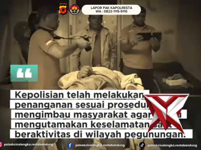 Polsek Cicalengka bersama Tim INAFIS Polresta Bandung melaksanakan evakuasi - PoliceTubeFeb 21, 2026 06:57 - Berita - 11 viewsPolsek Cicalengka bersama Tim INAFIS Polresta Bandung melaksanakan evakuasi terhadap seorang warga yang ditemukan meninggal dunia di jalur pendakian Gunung Cireuma Caang, tepatnya di wilayah Desa Nagrog, Kecamatan Cicalengka, Kabupaten Bandung. -