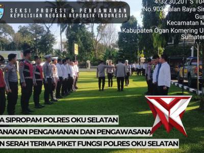 "Personil Sipropam melaksanakanPamwas Serah terima piket Fungsi"Apr 18, 2026 14:32 - Berita - 4 views"Personil Sipropam Polres OKU Selatan melaksanakanPamwas Serah terima piket Fungsi" -