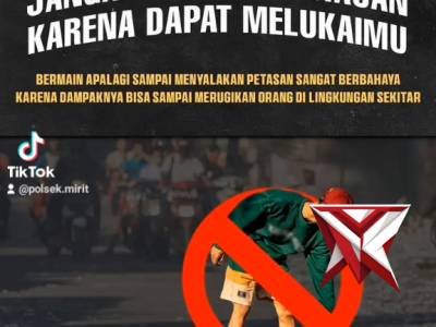 Awas bahaya main petasanFeb 23, 2026 21:45 - Berita - 9 viewsJangan Bermain Petasan, Membahayakan diri sendiri dan orang lain dan ada ancaman pidananya. -